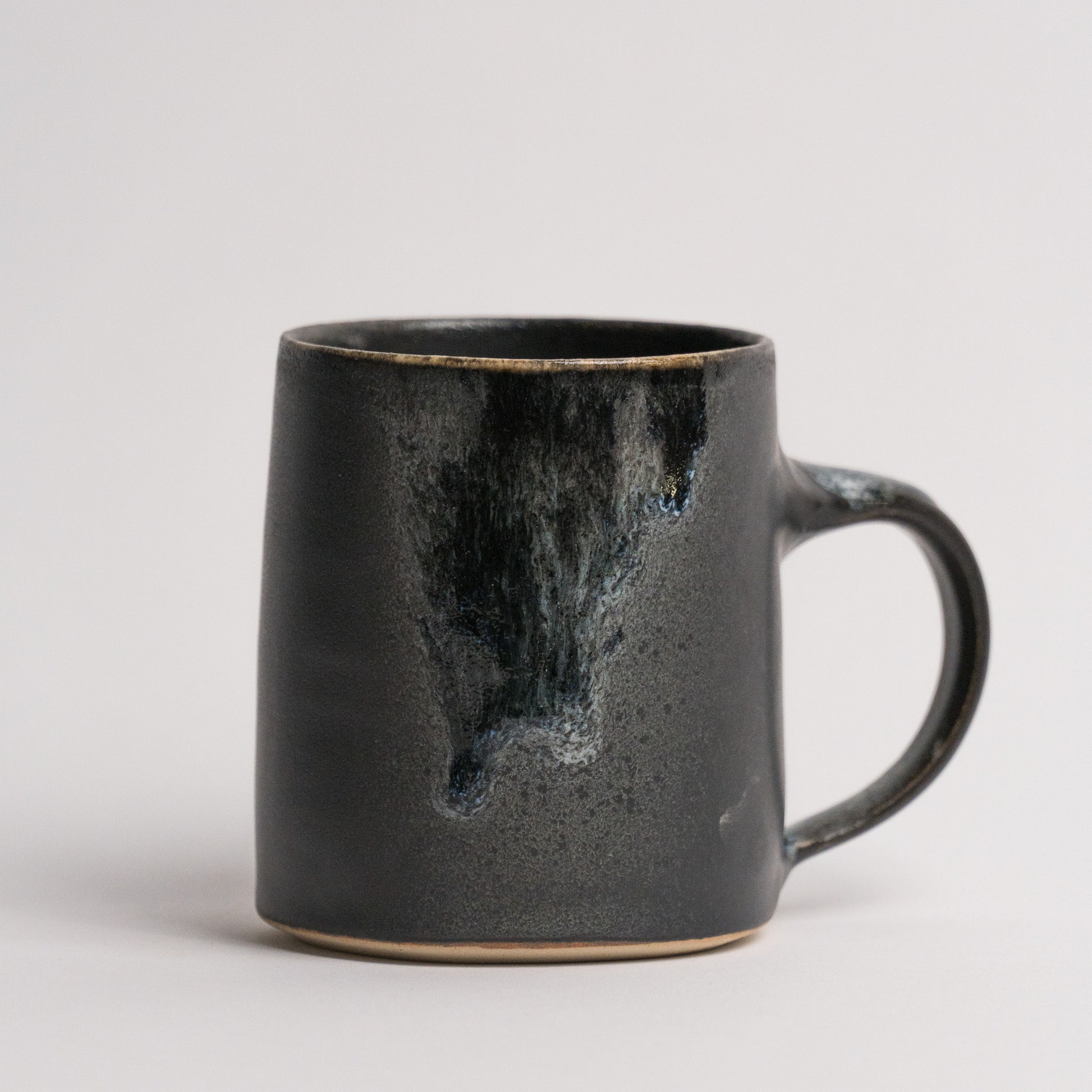 A hand thrown and turned cup with handle in black volcanic stoneware glaze. This version has a more tapered design.