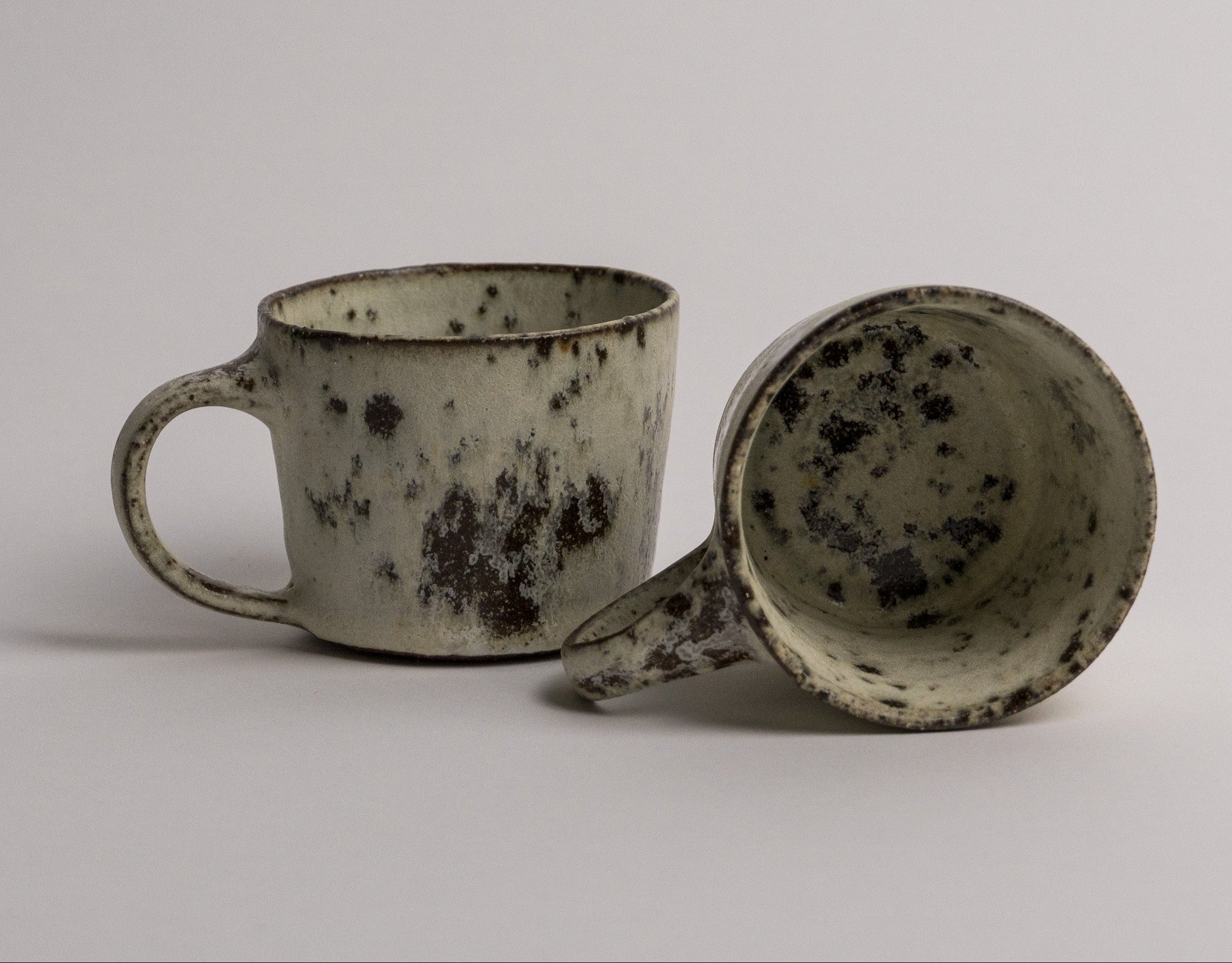 A hand thrown and turned cup with handle in a ochre brown matt glaze.