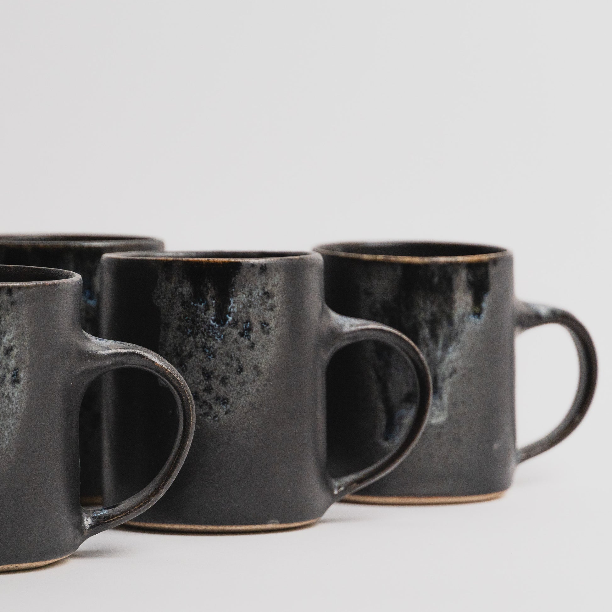 A hand thrown and turned cup with handle in black volcanic stoneware glaze.
