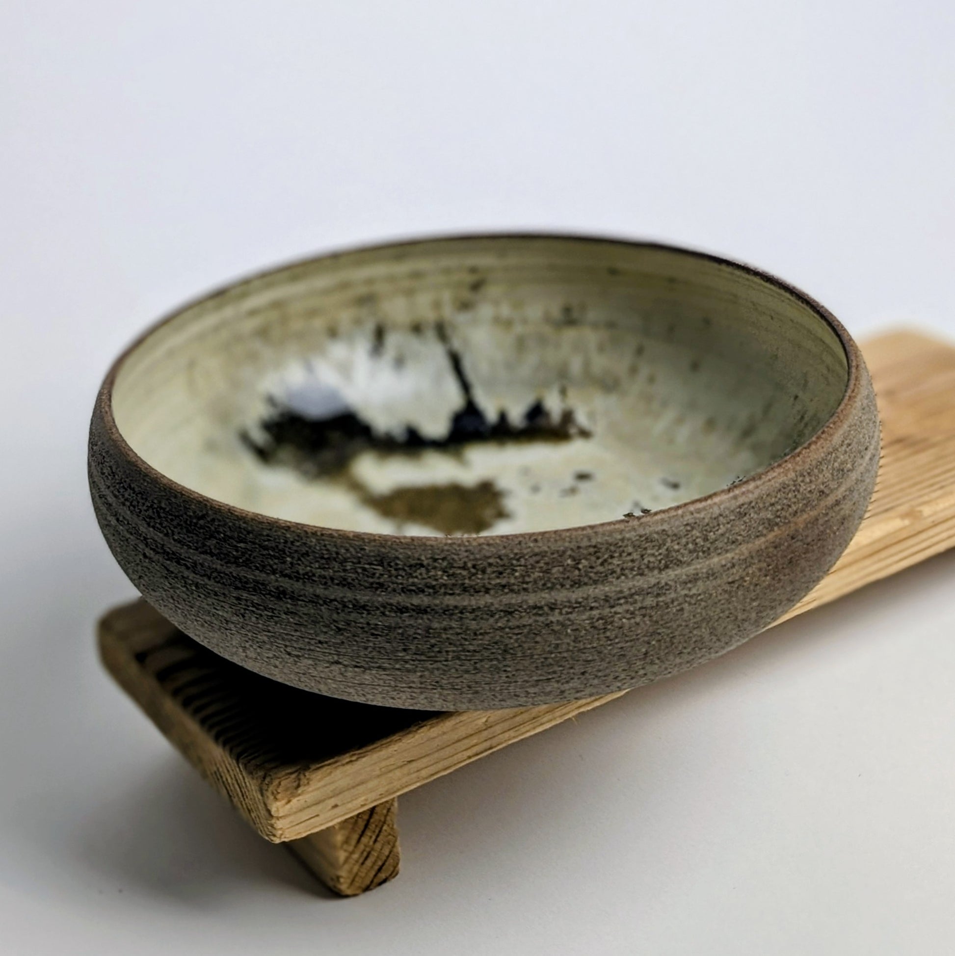 A bowl in dark grey/sand stoneware clay and glazed interior - hand thrown and turned stoneware bowl with offwhite to ochre interior glazing and unglazed exterior.