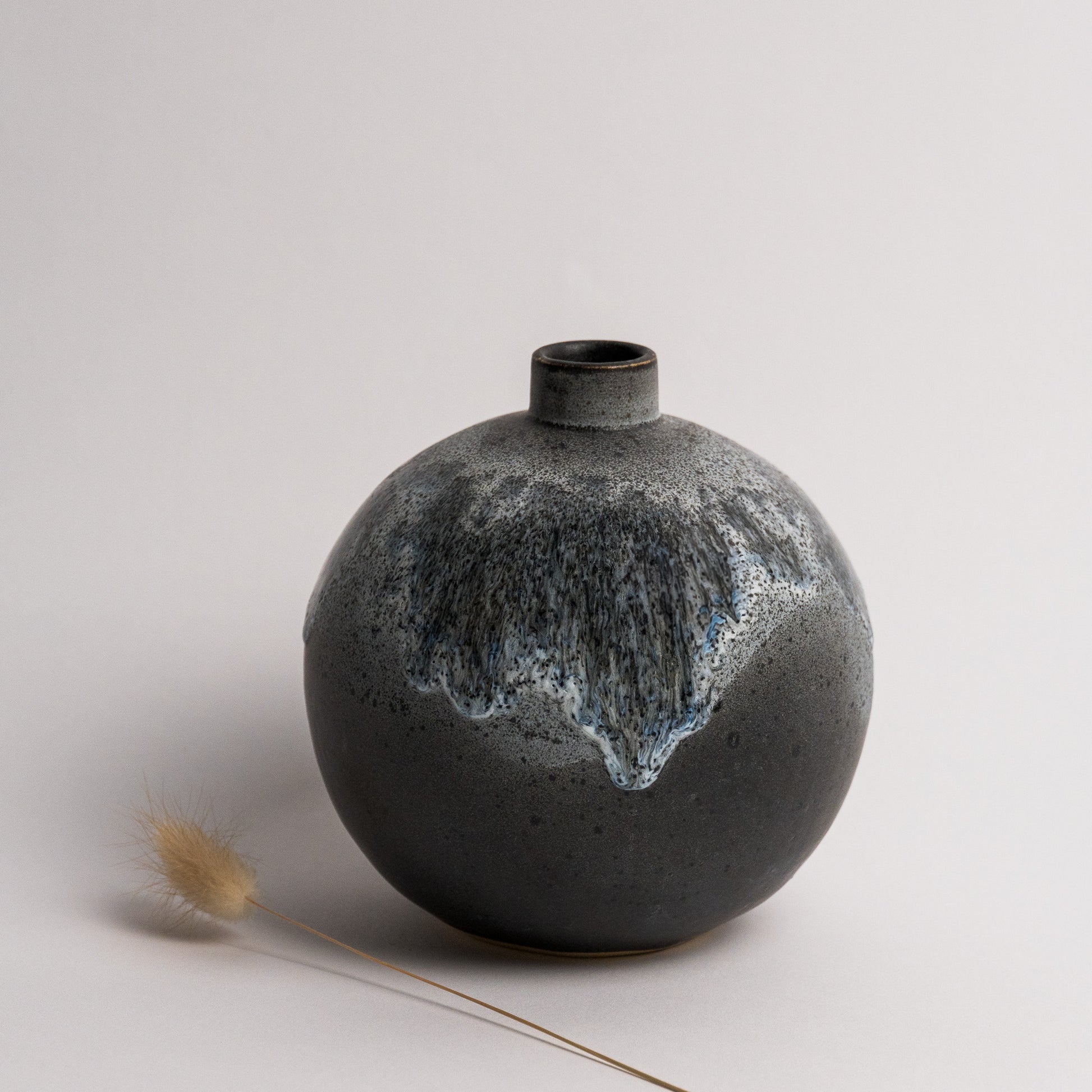 A small hand thrown black and white stoneware vase with a matt and shiny surface.
